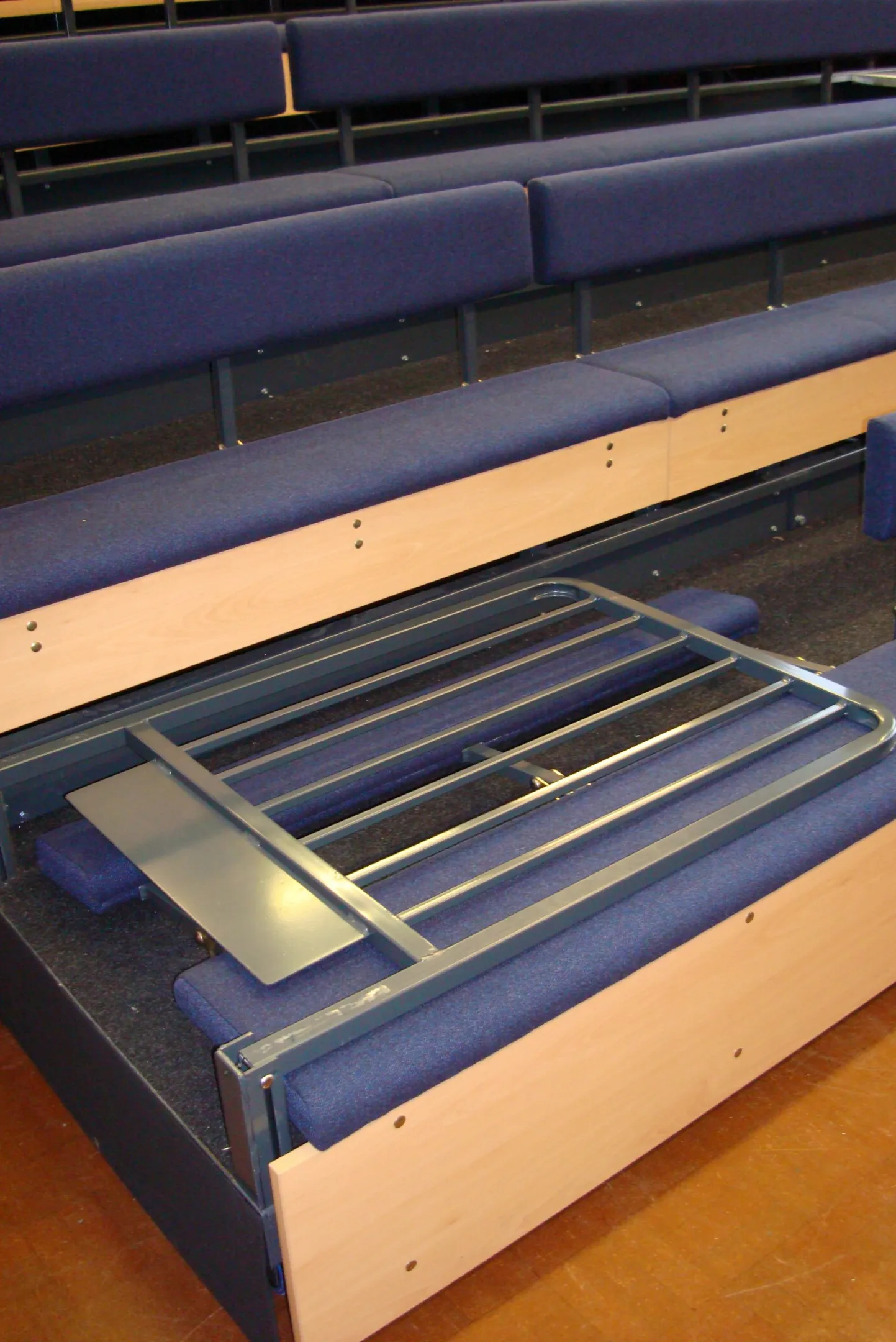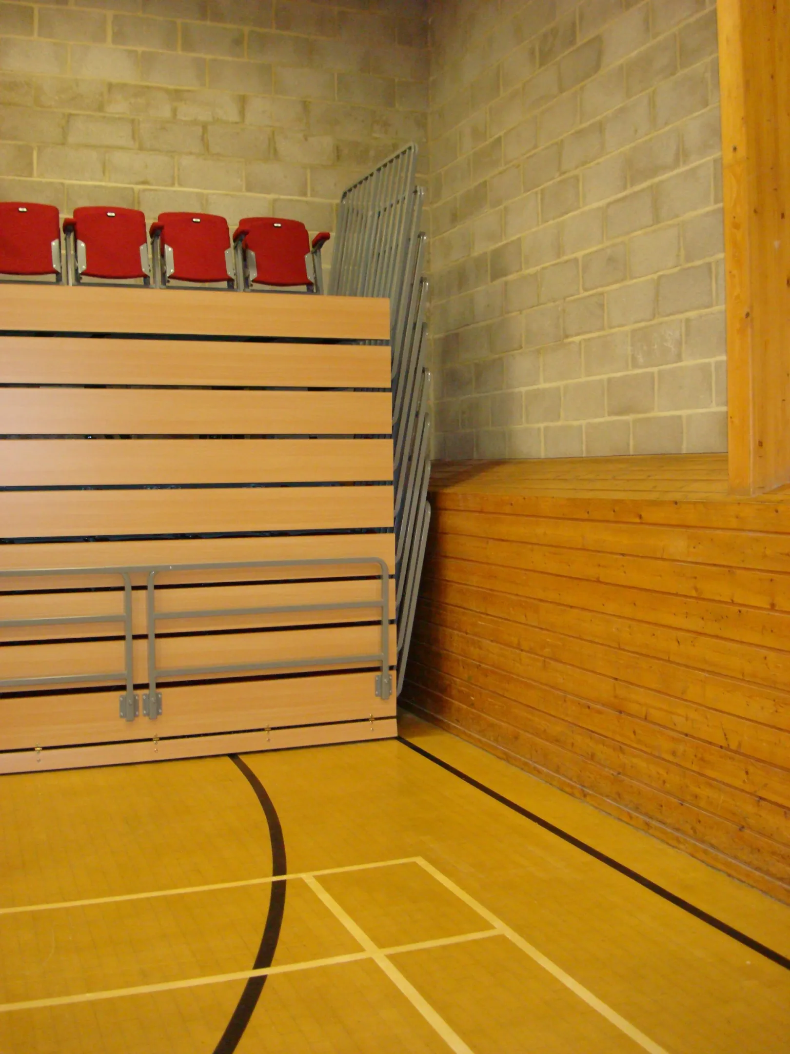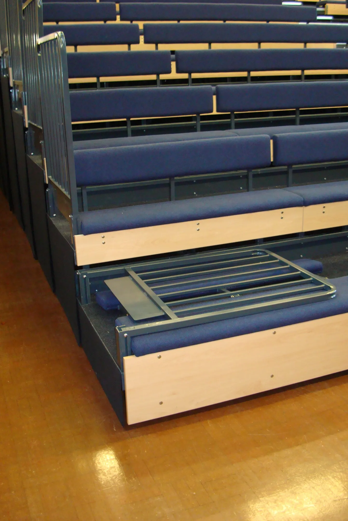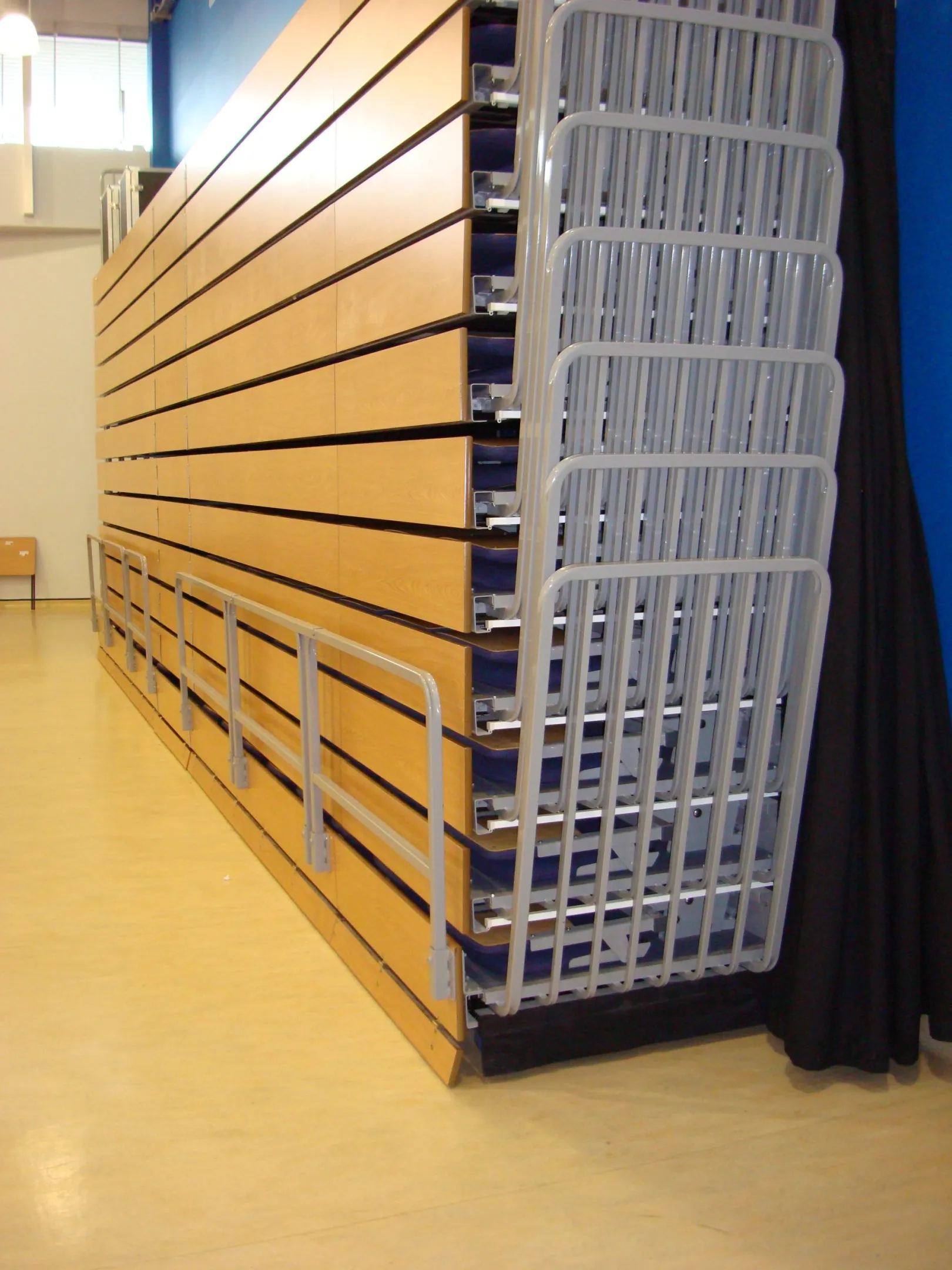 Deze hekwerken kunnen handmatig neergeklapt worden op het gangpad voordat de tribune inschuift en ze kunnen handmatig weer omhoog worden getrokken wanneer de tribune is uitgeschoven. Let wel: dat kan dus enkel en alleen wanneer de hekwerken zich naast het gangpad bevinden.