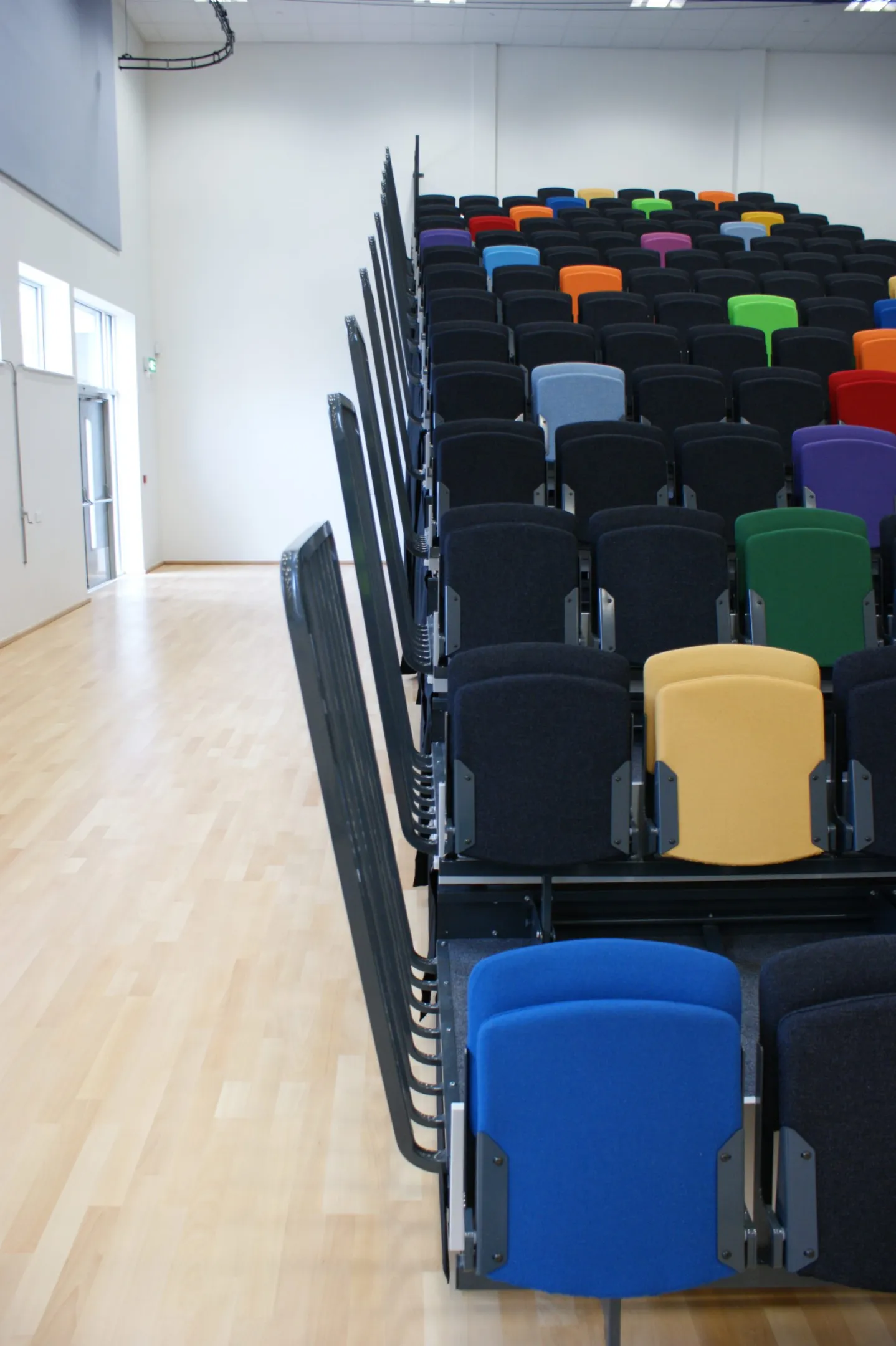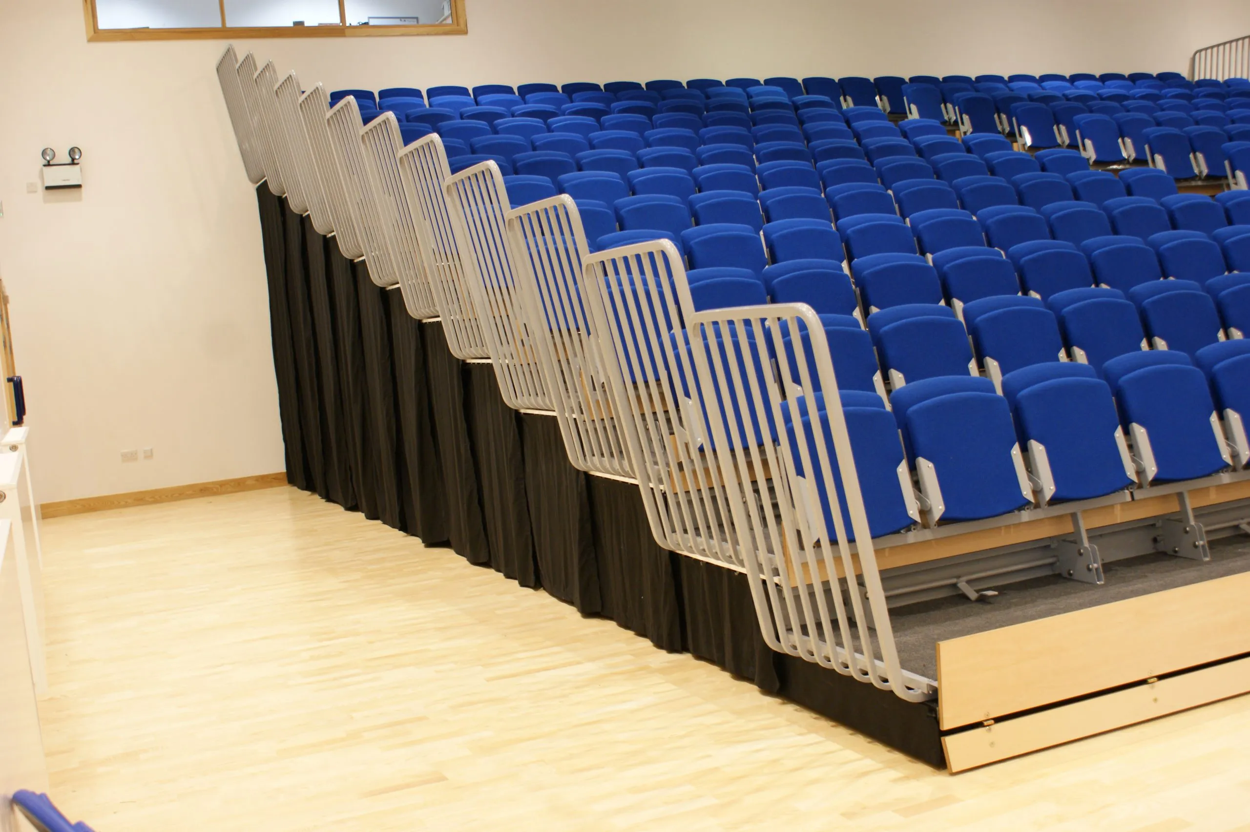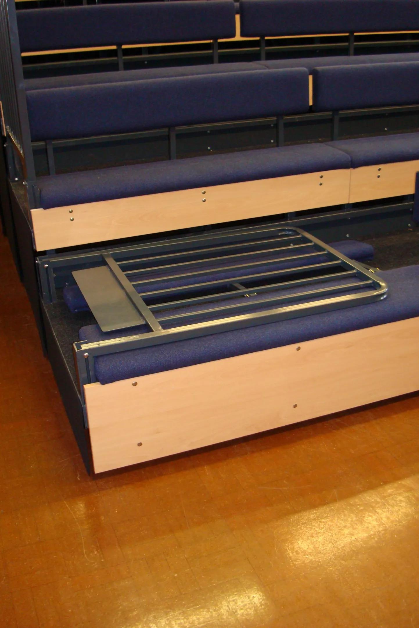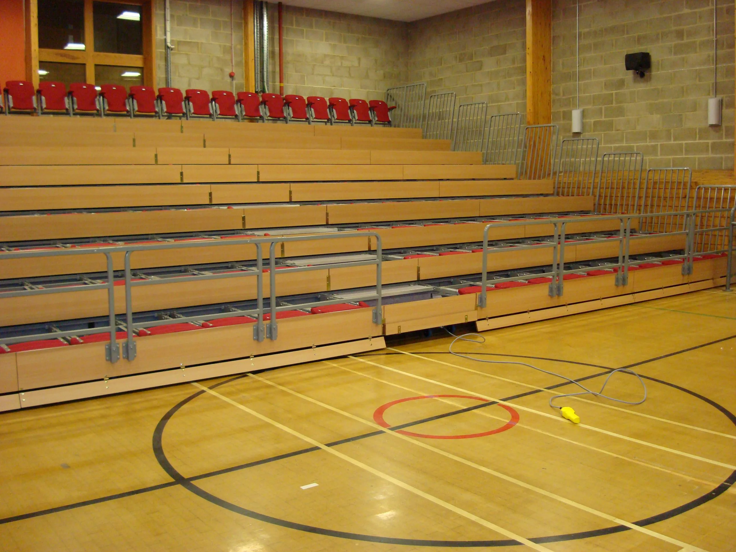 Deze hekwerken kunnen handmatig neergeklapt worden op het gangpad voordat de tribune inschuift en ze kunnen handmatig weer omhoog worden getrokken wanneer de tribune is uitgeschoven. Let wel: dat kan dus enkel en alleen wanneer de hekwerken zich naast het gangpad bevinden.