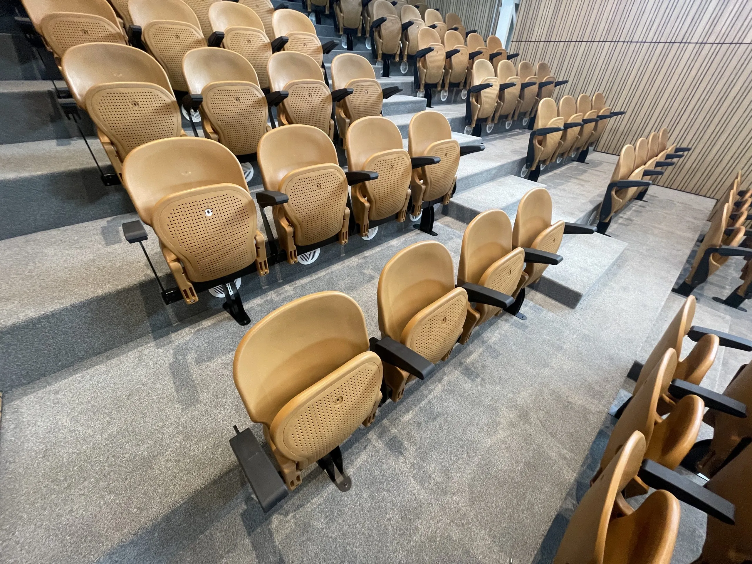 Deze stoel van leverancier Bluecube heeft een goede prijskwaliteit en vouwt compact in wat het een ideale keuze maakt voor gebruik op laag gebouwde telescopische tribunes. Deze stoelen worden gebruikt in grote arena’s, stadions, voor onderwijs en voor inschuifbare tribunes. De zittingen zijn verkrijgbaar in kunststof of met bekledingskussens. Meerdere maatopties: 460 mm en 480 mm. Armleuningen, evenals bekerhouders zijn mogelijk.Een vaste tribune is niet inschuifbaar. De tribune wordt opgebouwd uit hout en wordt bekleed. Echter kunnen de stoelen wel inklapbaar gemaakt worden. Zie hiervoor deze pagina.