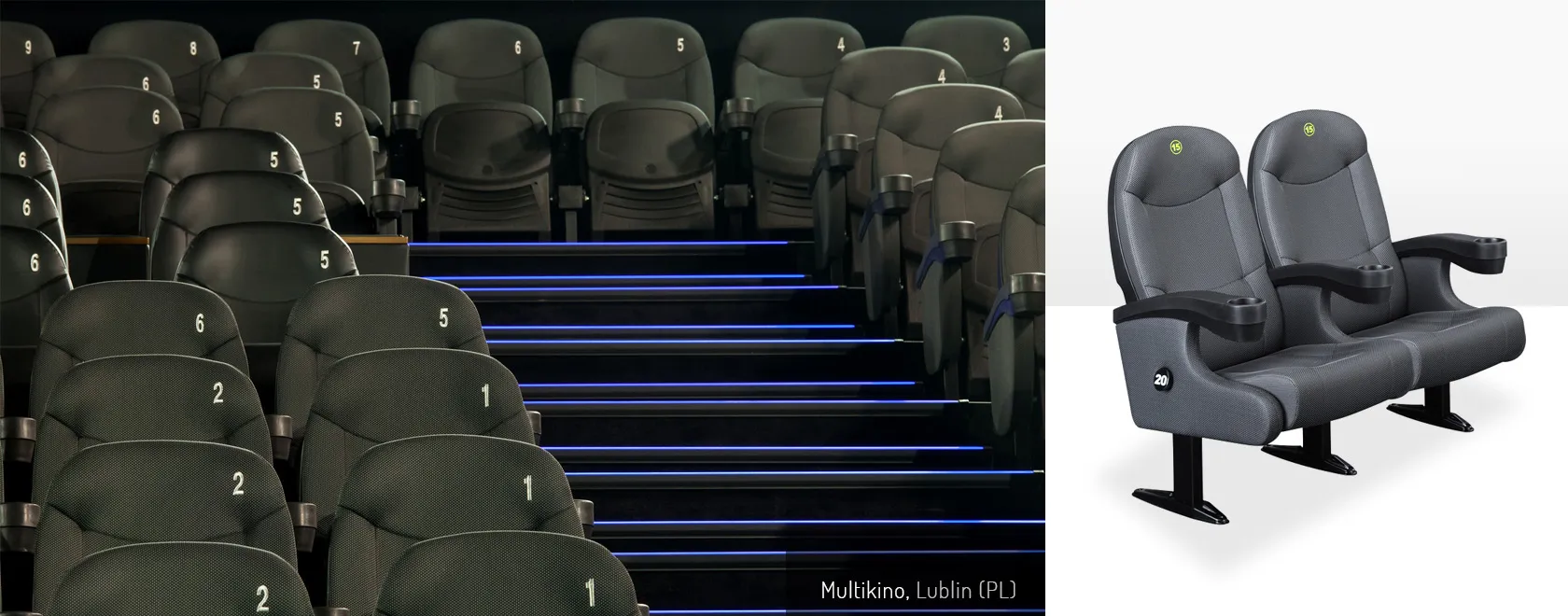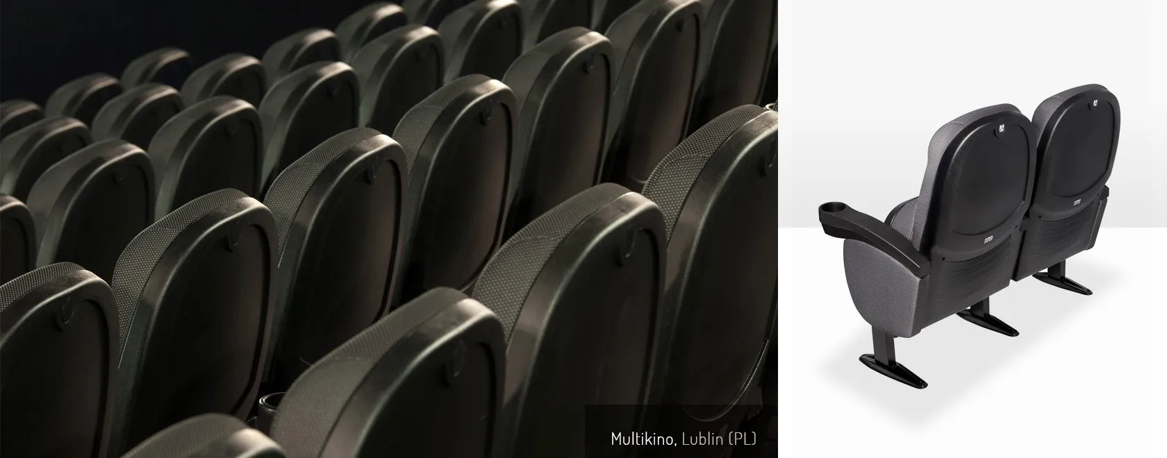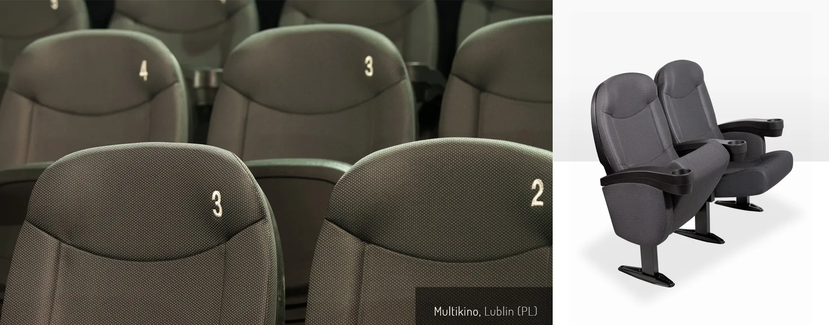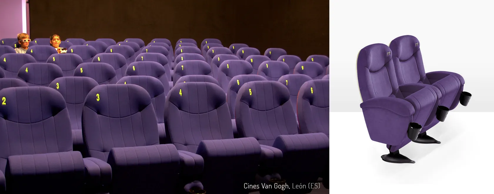 De Olympo stoel is tevens speciaal ontworpen voor bioscoopzalen. De stoel is opgebouwd uit beklede 60mm MDF platen en stalen buisframe (ST-37). De bekerhouders en het vouwsysteem zijn gemaakt van polypropyleen