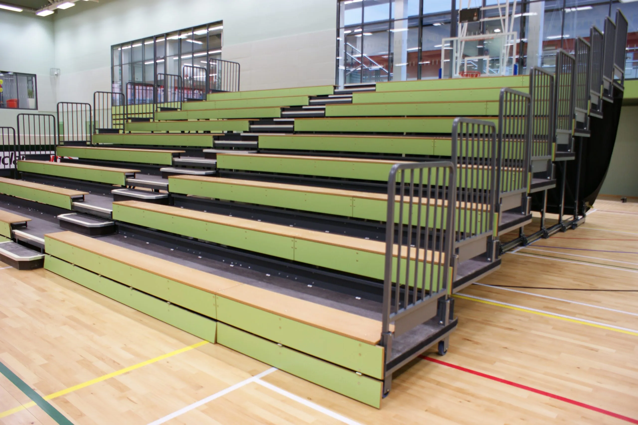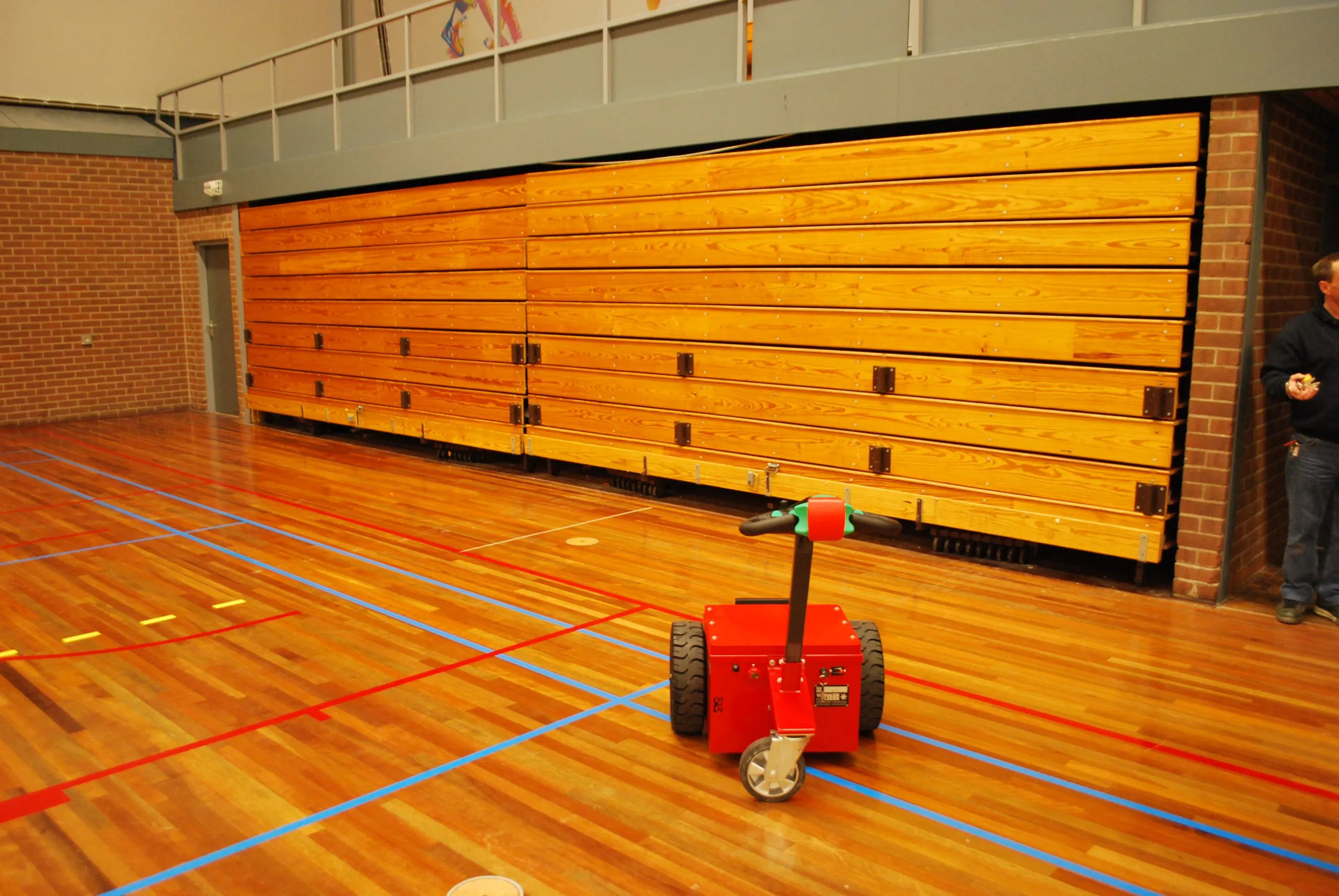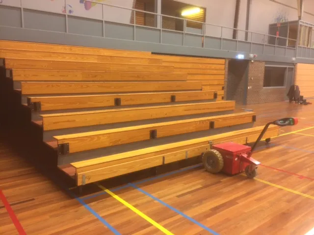 Door ons unieke uitrijsysteem kan de tribune nooit scheef uitrijden en de vloer niet beschadigen. U heeft geen moeilijk, duur onderhoudsonvriendelijk kettingsysteem nodig. Voor elke vloer hebben we een oplossing. Onze tribunes beschadigen de vloer niet. Bij echt zachte vloeren, gebruiken we extra vloerplaten die de druk verdelen.